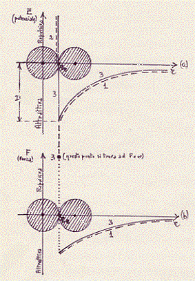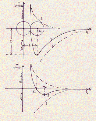 Quando due atomi (o molecole), si avvicinano tra di loro considerevolmente rispetto agli altri atomi (o molecole), allora c’è la possibilità che si formi un legame chimico. Supponiamo che questi due atomi (fissiamo le idee su due atomi) si possano rappresentare come due sfere rigide,(19) vediamo cosa succede, in termini di energia (e di forza),(19) quando questi due atomi si avvicinano tra di loro fino ad arrivare a contatto. Costruiamoci dei grafici: