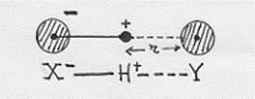Pensando a come stanno le cose si capisce subito che la grande energia U di interazione che si riscontra è dovuta alla piccolezza del protone dell’idrogeno che sta in mezzo agli atomi X ed Y; infatti questa piccolezza permette un, grande avvicinamento r tra il gruppo X–—-——H+ e l’atomo Y: