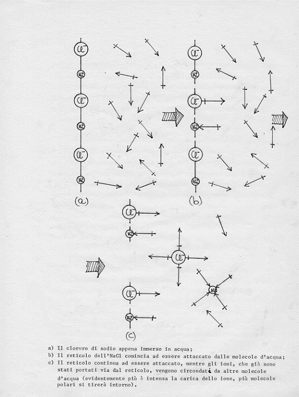 Quando si mette l’NaCl (che è un solido cristallino, vedi oltre) in H2O, le molecole di acqua, che sono polari,(12) attaccano il reticolo cristallino dell’NaCI con una forza di origine elettrostatica che sopravanza quella, sempre di origine elettrostatica che lega insieme (in un legame ionico) lo ione Na e lo ione Cl.