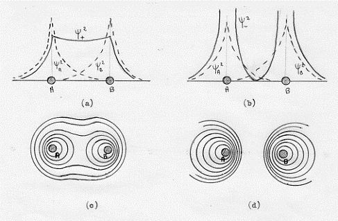 Nel caso di ψ+2 abbiamo che la densità di carica elettrica è maggiore di quella che si avrebbe considerando le ψA e ψB separate, della quantità 2 ψAψB e che questa densità di carica elettronica è concentrata nella regione compresa fra i due nuclei (questo fatto comporta un abbassamento dell’energia di interazione con una conseguente attrazione, in accordo con quanto sappiamo: energia negativa = attrazione).