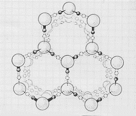 (16) Le forme cristalline in cui può esistere il ghiaccio sono diverse (come hanno mostrato studi condotti sotto la direzione di Bridgmann e lavori di Lonsdale del 1958). Tutte le forme cristalline del ghiacci®o sono più dense dell’acqua, tranne il ghiaccio I che è meno denso proprio perché ha la struttura aperta (esagonale) mostrata in figura 26. A temperatura di – 80 °C il ghiaccio cristallizza nella forma cubica, come il diamante (si veda più avanti). E’ proprio il legame idrogeno che favorisce la struttura aperta del ghiaccio I. Quando si ha una prevalenza di questo legame vuol dire che le molecole sono disposte in modo tale da formare un cristallo con ampi spazi vuoti. Una diversa orientazione delle molecole non permetterebbe l’esistenza del legame idrogeno.