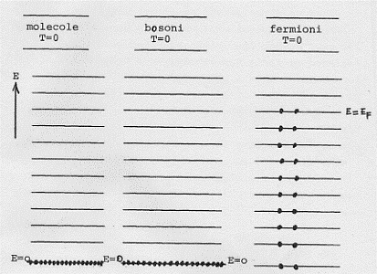 Una cosa del tutto diversa accade quando si ha a che fare con un gas di fermioni: un solo fermione si troverà nello stato a cui compete energia zero, tutti gli altri andranno ad occupare stati ad energia superiore fino a che non siano esauriti i fermioni stessi (livello energetico EF).