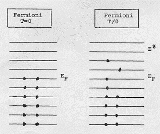 Se innalziamo la temperatura, tutte le particelle di Boltzmann e di Bose acquistano energia saltando, senza nessuna limitazione nell’occupazione dei livelli, sui livelli ad energia più alta; le particelle di Fermi invece si comportano in modo diverso: quel le che stanno nei livelli energetici più bassi non possono, in alcun modo, acquistare energia (poiché ad un acquisto di energia corrisponde il salto in un livello superiore il quale essendo già occupato da due elettroni non permette che se ne aggiunga un altro); le uniche particelle che acquistano energia sono quelle prossime al livello di Fermi che hanno, immediatamente sopra, livelli energetici liberi che possono occupare: