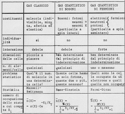Quando un gas è in condizioni normali, le particelle che lo compongono hanno a disposizione tante celle e quindi c’è poca probabilità che in una stessa cella capiti più di una particella: in questo caso allora non c’è differenza sostanziale fra le tre statistiche. Quando invece ci si avvicina allo zero assoluto, le celle a disposizione del gas diminuiscono notevolmente e quindi aumenta di molto la probabilità di avere più di una particella per cella; in questo caso nasce allora la sostanziale differenza tra le tre statistiche ed in particolare tra quelle di Maxwell-BoItzmann e Bose-Einstein da una parte (più di una particella per stato) e quella di Fermi-Dirac dall’altra (una sola particella per stato).