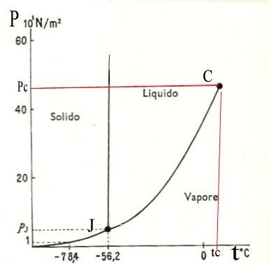 Il diagramma di Andrews pressione-temperatura per una data sostanza. Ricordo che J è il punto triplo, C è il punto critico e la linea tratteggiata è la linea della tensione di vapore (al di sotto di tale linea vi è il vapore della sostanza considerata.