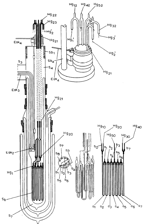 Uno schema che dà l’idea del manometro di cui disponeva Onnes. Si trattava della sistemazione di una serie di manometri differenziali montati in modo che la pressione da misurare passasse dall’uno all’altro e fosse garantita la migliore misura. In totale si aveva una colonna di mercurio di 45 metri. Dalla Nobel Lecture di Onnes.