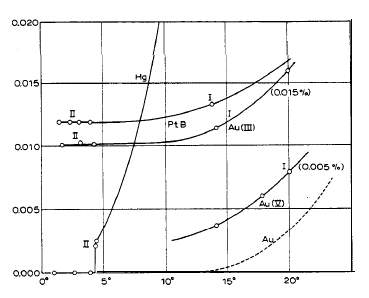 La curva del mercurio è quella che viene giù ripida (vi è una qualche differenza con la precedente figura perché ora in ordinate abbiamo una scala differente). In alto vi è la curva del Platino (Pt) impuro la cui resistitività era stata misurata prima alla temperatura dell’idrogeno liquido (I) quindi a quella dell’elio liquido (II). Subito al disotto la curva per l’oro (Au) impuro con le stesse considerazioni fatte per il platino. Ancora più in basso le curve per l’oro puro.