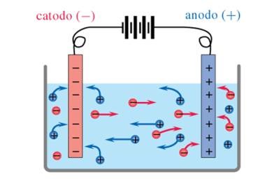 L’elettrolisi è un fenomeno conosciuto da moltissimi anni e fu Faraday nel 1834 a studiarlo e comprenderlo. In un recipiente (cella elettrolitica) si pone dell’acqua dentro cui si versa un qualche acido o sale (l’acido o il sale sono chiamati elettroliti). Le molecole dell’acido (o sale) si spezzano spontaneamente in ioni positivi (cationi) e negativi (anioni) che restano casualmente vaganti nell’acqua. Se nel recipiente disponiamo due elettrodi metallici collegati ad una batteria, ci sarà un passaggio di corrente nella soluzione e si produrranno reazioni chimiche. In definitiva otteniamo una migrazione di ioni positivi verso l’elettrodo negativo (catodo) e di ioni negativi verso l’elettrodo positivo (anodo) [le cose sono un poco più complesse ma quanto detto è sufficiente ai nostri fini]. L’esempio più semplice è quello del cloruro di sodio (sale da cucina) con formula chimica NaCl. Se mettiamo in una cella elettrolitica del sale, quando esso entra in acqua si separa nei due ioni Na+ e Cl–. Il simbolo + indica che l’atomo Na di sodio ha un elettrone in meno mentre il simbolo – indica che l’atomo Cl di cloro ha un elettrone in più. I due atomi, neutri se considerati isolati, sono diventati ioni, dotati cioè di carica elettrica, quando da una molecola si dissociano in soluzione. Se colleghiamo gli elettrodi alla batteria le cariche positive andranno verso l’elettrodo negativo e viceversa per le negative. Quando un catione (ione positivo) arriva al catodo (elettrodo negativo) da esso prende l’elettrone che gli manca e ritorna neutro. Altrettanto accade all’anione che arriva all’anodo: arrivato lì perde l’elettone che ha in più e diventa neutro. E’ appena il caso dire che l’esempio fatto prevede un elettrone in più o in meno nei due ioni ma vi sono casi di vari elettroni in più o in meno nei due ioni. Ma questa non è l’unica reazione possibile perché esiste anche quella che prevede l’assorbimento o la cessione di elettroni in corrispondenza del catodo e dell’anodo, rispettivamente. Il primo caso si può esemplificare con delle molecole d’acqua (neutre ma polari) che dal catodo assorbono degli elettroni originando una molecola di idrogeno H2 e due ossidrili OH–: