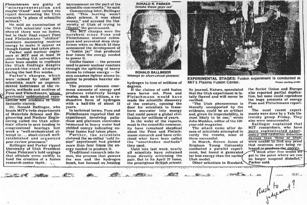 Il discredito su questa scoperta fu probabilmente indotto dall’Università di Salt Lake City. La fretta di annunciare la scoperta per ottenere finanziamenti, l’eccessiva enfasi data alla medesima, l’annuncio tramite conferenza stampa di un qualcosa ancora non perfettamente definito sono sempre esiziali al modo di procedere in ambito scientifico (è da notare che Fleischmann e Pons, in conferenza stampa, non fornirono tutti i dettagli dell’esperienza perché l’Università non aveva ancora concluso le pratiche del brevetto). Quando una qualunque scoperta ha un qualche sapore di grande novità con possibilità applicative non troppo nascoste i mass media si lanciano su di essa e la bruciano perché viene indotta nel pubblico la credenza che i risultati saranno disponibili in tempi molto rapidi. Se poi questo non accade gli stessi mass media si scagliano contro chi ha dato una tale illusione. Ma c’è dell’altro perché un’altro scienziato, Steven Jones (Brigham Young University), aveva intuito cose analoghe (la presenza di fenomeni nucleari spontanei) per vie completamente diverse, osservando alcune reazioni che si producevano nelle rocce vulcaniche. Avrebbero dovuto incontrarsi i tre per discutere a fondo la questione e per darne un annuncio insieme attraverso un articolo in una rivista scientifica. Ma poi, come detto, fu molto probabilmente l’Università di Fleischmann e Pons che spinse a dare l’annuncio nel modo indicato. Un altro aspetto legato alla priorità di eventuale pubblicazione, in questo caso su Nature, non è stato chiarito dal direttore dell’epoca della rivista, John Maddox. Sembrerebbe che nello stesso giorno della convocazione della conferenza stampa di Fleischmann e Pons (il 23 marzo), sia stato presentato a Nature, da Steven Jones, un articolo sull’argomento, ma Maddox rifiutò spiegazioni su questo problema ed anche sull’eventualità che i due chimici abbiano, a loro volta, presentato un articolo sulla Fusione Fredda.