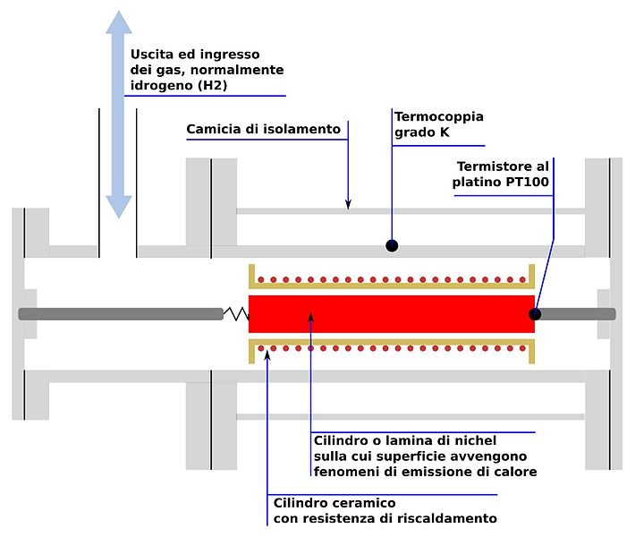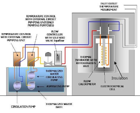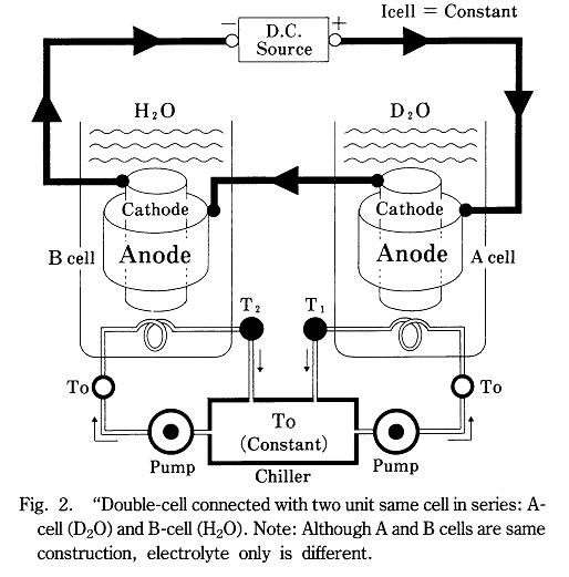 Con riferimento alla figura: si ha una cella elettrolitica inserita dentro un vaso Dewar per evitare scambi di calore con l’esterno; il Dewar è a sua volta inserito in un bagno termico che garantisce ancora meglio la costanza della temperatura; l’anodo della cella è di platino mentre il catodo è di palladio; invece di normale acqua distillata nella cella vi è acqua pesante(1); in quest’acqua si diluisce un elettrolita che, come nell’elettrolisi ordinaria, si divide in anioni e cationi. L’elettrolisi di Fleischmann e Pons prevedeva la migrazione dei cationi 2H+ oppure D+ (deuterio presente nell’acqua pesante) verso il catodo di palladio. Questi ioni vengono via via assorbiti dal palladio “fino a riempire il proprio reticolo cristallino con quantità molto elevate di atomi rispetto allo spazio ristretto a disposizione, così da raggiungere una densità tale da innescare la fusione nucleare” [Germano].