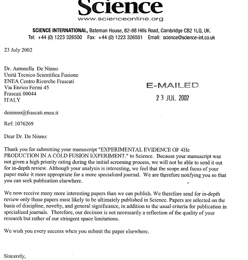 Se volete sapere che cosa è successo in una sola istituzione, il MIT, quando un nuovo paradigma mise a rischio il ben avviato programma di ricerca sulla fusione calda, insieme a certi interessi intellettuali come quelli che il Prof. Feshbach difendeva così vigorosamente, leggete il mio rapporto di 55 pagine su questa tragedia monumentale a www.infinite-energy.com.