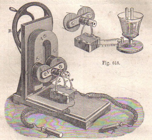In essa, anziché avere le variazioni di flusso di campo magnetico al di sotto dei poli magnetici, la si originava a fianco del magnete permanente A mediante due bobine B e B’ messe in rotazione da un sistema a manovella R. Si può notare che a e b sono i due contatti striscianti che lavorano su un commutatore (se così non fosse non si avrebbe l’elettrolisi dell’acqua come mostrato nella figura piccola a lato nella quale la corrente prodotta viene convogliata ad un voltametro). Tale macchina era essenzialmente utilizzata in laboratori scientifici perché poteva fornire corrente in modo più economico (ed a maggiore intensità) delle pile. Ma se ne vendevano molte per le solite e mai finite manie terapeutiche: il paziente prendeva i terminali elettrici e qualcuno azionava la manovella. La quantità di corrente che avrebbe dovuto alleviare le pene dei pazienti poteva essere variata variando la velocità di rotazione della manovella.
