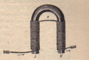 Elettromagnete a ferro di cavallo, il primo efficiente dei quali fu realizzato da Sturgeon. Si è ora utilizzata una barra di ferro piegata ad U con due avvolgimenti di rame alle due estremità. In questo caso il rame deve essere avvolto in versi opposti nei due poli. La prima figura è relativa al semplice elettromagnete, la seconda dispone di un pezzo di ferro disposto tra i due poli che ha la funzione di chiudere il circuito magnetico