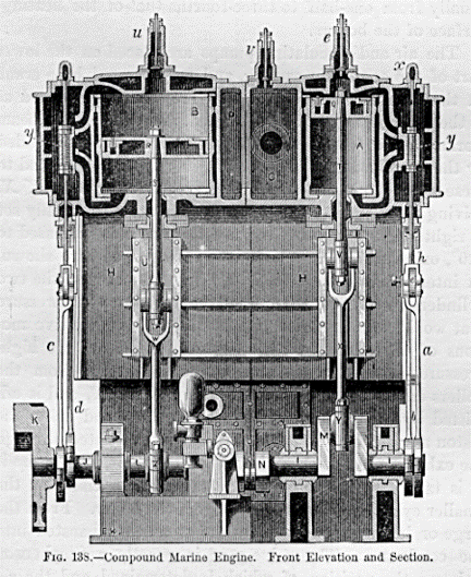 Intorno alla metà del secolo, su navi che dovessero affrontare la traversata atlantica, restava il problema della macchina a vapore, se essa dovesse lavorare ad alta o bassa pressione. E la questione era connessa all’espansione del vapore, se esso dovesse espandersi in uno o più cilindri. Si arrivò a macchine che avevano due cilindri, uno dove si potesse espandere il vapore ad alta pressione e l’altro dove potesse espandersi il vapore che, dopo la prima espansione, era a bassa pressione. I cilindri, che potevano diventare quattro, due per l’alta e due per la bassa pressione, erano ambedue connessi allo stesso albero motore. Questo arrangiamento che utilizzava simultaneamente alta e bassa pressione su un’unica macchina (il vapore ad alta pressione, dopo aver fatto lavoro, perde pressione anche se è ancora in grado di compiere lavoro e quindi, invece di scaricarlo, si capì che era meglio utilizzarlo in un cilindro adatto allo scopo), fece pensare alla possibilità di usare simultaneamente due macchine, una per l’alta e l’altra per la bassa pressione. E la cosa venne realizzata con successo (anche se con ritardo a seguito di antiquati mezzi di costruzione delle navi medesime), solo nei lunghi viaggi come i transatlantici, risparmiando non solo sul costo del carbone (ne occorreva meno) ma anche sul costo che comporta il suo stivaggio (meno carico). Un calcolo approssimato dava, con le due macchine, un risparmio di 1/4 di sterlina per cavallo ogni ora. Ciò, su un grande transatlantico, comportava un risparmio di 100 tonnellate di carbone e quello dello spazio che il medesimo carbone liberava per altri carichi. Alcune difficoltà si incontrarono in dei solfati che si depositavano nella caldaia quando era ad alta pressione ma presto si scoprì che il rimedio era di pompare nella caldaia sufficiente acqua di mare per prevenire quel deposito che era conseguenza di una soluzione soprasatura. Ma questo rimedio comportò, a sua volta, altri problemi nel condensatore (che era piuttosto complesso tanto che si ebbero seri problemi per trovare dei tecnici che se ne occupassero in navigazione). La soluzione di questi problemi rese più praticabile l’alta pressione nelle macchine composte. E la riprova la si ha da quanto l’Ammiragliato comunicò: le macchine composte possono utilmente essere usate in navi da guerra.