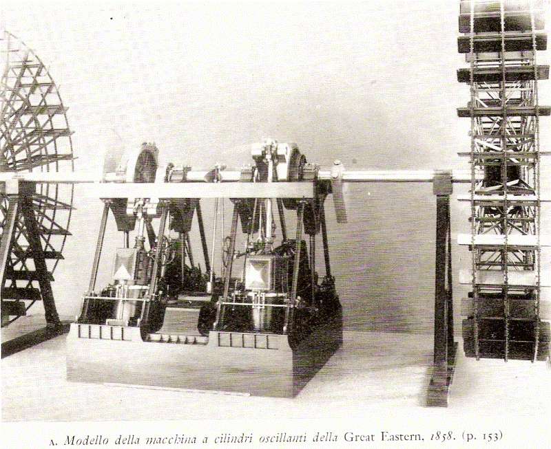 Anche sulla Great Eastern si dovette affrontare il problema della distanza verticale tra l’asse della macchina a vapore e la posizione della ruota a pale. Il problema venne qui risolto mediante l’oscillazione dei 4 cilindri. Ciascun cilindro aveva un diametro di poco meno di due metri ed una corsa di oltre 4 metri per una potenza complessiva di 3410 cavalli che muoveva ruote a pale di un diametro di 17 metri ad una velocità di circa 11 giri al minuto (oltre all’elica) e ad una velocità della nave di 15 nodi.