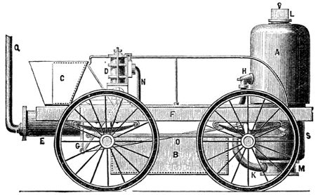 Trevithick era un inventore molto prolifico e, prima della macchina ora accennata, nel 1800, sempre in Cornovaglia, aveva costruito e poi collaudato nel 1802 anche una carrozza a vapore in grado di trasportare persone. Una delle caratteristiche della macchina, simile alla precedente (per mantenere caldo il cilindro, qui verticale, fu inserito parzialmente nella caldaia), era relativa al vapore di scarico che veniva immesso nel camino per aumentare il tiraggio della caldaia (Trevithick non pensò a brevettare questo dispositivo che avrebbe potuto arricchirlo, laddove morì povero). La struttura portante della carrozza, la macchina a vapore che la muoveva, è mostrata nella figura seguente. Si deve tener conto che tale macchina era molto versatile e poteva essere usata anche come macchina a vapore ad installazione fissa e per ogni funzione gli fosse richiesta (si trattava di un superamento importantissimo del bilanciere).
