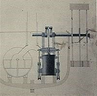 Una foto di una piccola macchina di Watt come quella riportata nello schema precedente (manca la caldaia). Sulla sinistra si distingue il cilindro dentro il quale corre lo stantuffo il cui asse è collegato con il bilanciere che, all’altro estremo, ha una barra collegata al rotismo planetario (la selva di tubicini è del cassetto di distribuzione del vapore nel cilindro)