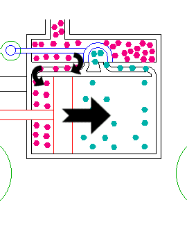 Cassetto di distribuzione del vapore. Riferendoci alla figura, si vede chiaramente il percorso del vapore: in (a) il vapore proveniente dalla caldaia spinge il pistone verso destra; nel far questo sposta anche quel piccolo pezzo (a forma di U rovesciata) che va a chiudere il passaggio proprio a questo vapore e ad aprire la possibilità per esso di entrare dall’altra parte, come mostrato in (b). La cosa si ripete ad ogni spostamento del pistone.