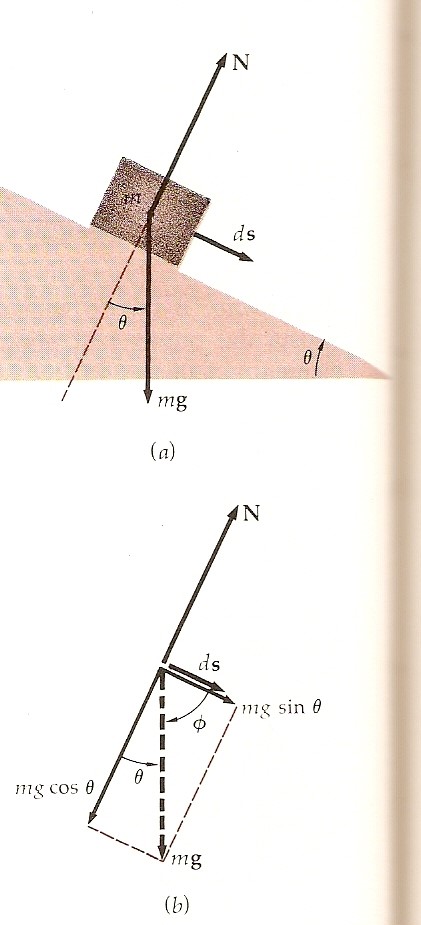 Le forze che agiscono sulla particella sono il peso mg e la forza di contatto N esercitata dal piano, la quale è perpendicolare al piano poiché questo è liscio. Queste forze sono indicate nella figura. La forza normale N, essendo perpendicolare al moto, non esegue lavoro. L’unica forza che esegue lavoro è il peso mg, che ha la componente mg sin θ nella direzione del moto. (Si rilevi che l’angolo φ fra il peso e la direzione del moto è il complemento dell’angolo di inclinazione θ. Perciò l’elemento di lavoro eseguito dal peso è dL = mg cos φ ds = mg sin θ ds). Poiché il peso è costante, il lavoro eseguito sulla distanza s è semplicemente mg sin θ s. È il lavoro totale eseguito da tutte le forze, e perciò è uguale alla variazione dell’energia cinetica, che è semplicemente ½mv2 perché la particella parte dalla quiete. Perciò il teorema dell’energia cinetica dà: