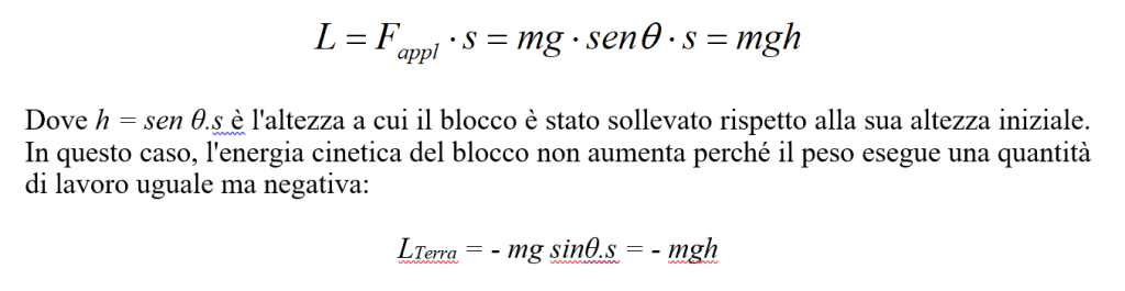 Ma si può convertire in una variazione dell’energia cinetica il lavoro eseguito dalla forza applicata, liberando il blocco e lasciandolo ridiscendere strisciando lungo il piano inclinato. Il peso eseguirà allora una quantità di lavoro positiva mg sin θ s = mgh, che è uguale all’aumento dell’energia cinetica perché è l’unico lavoro eseguito sul blocco.