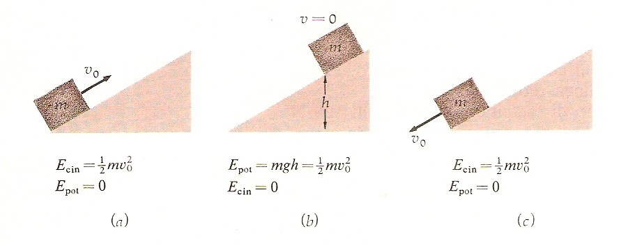 Poiché questo lavoro negativo è uguale all’aumento dell’energia potenziale mgh, l’altezza massima raggiunta dal corpo è data da mgh = ½mv02 (vedi figura). (Di nuovo l’altezza è indipendente dall’angolo d’inclinazione del piano). Il corpo si arresta momentaneamente a questa altezza e poi ridiscende strisciando lungo il piano, acquistando energia cinetica e perdendo energia potenziale. Quando raggiunge il suo punto di partenza, la sua energia cinetica è di nuovo ½mv02.
