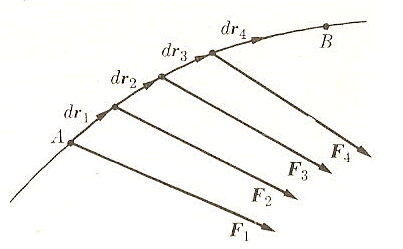 La (1) fornisce il lavoro per uno spostamento infinitesimo. Il lavoro totale compiuto sulla particella nel passaggio da A a B (vedi figura) è la somma di tutti i lavori infinitesimi compiuti durante i successivi spostamenti infinitesimi.