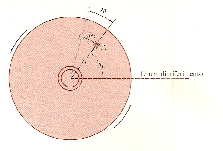Consideriamo una particella di una ruota che gira intorno al suo asse di simmetria, fisso nello spazio. Si può specificare la posizione della particella Pi mediante la distanza ri dal centro della ruota e l’angolo θ fra una retta condotta dal centro alla particella e una retta di riferimento nello spazio, com'è indicato nella figura.