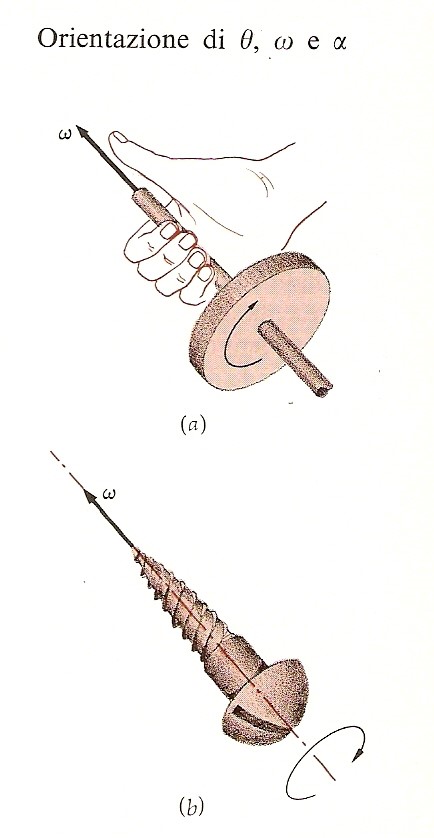 Abbiamo scelto la direzione per ω lungo l’asse di rotazione, ma dobbiamo ancora decidere il verso di ω, cioè, per questa rotazione, se ω entra nel piano del foglio o esce dal piano del foglio. La scelta è convenzionale. Se la rotazione è oraria, come nella figura, ω è rivolta verso l’interno; se è antioraria, ω è rivolta verso l’esterno. Questa decisione arbitraria è chiamata regola della mano destra, com’è illustrato nella figura (a). Quando l’asse di rotazione è afferrato con la mano destra con le dita piegate nel verso della rotazione, il pollice disteso è orientato nella direzione e nel verso di ω. La direzione e il verso di ω sono anche quelli in cui avanza una vite destrorsa nella sua rotazione, com’è illustrato nella figura (b). Il verso dell’accelerazione angolare (per la rotazione intorno a un asse fisso) dipende dal fatto che ω sia crescente o decrescente. Se ω è crescente, α è concorde con ω; se ω è decrescente, α è discorde con ω.