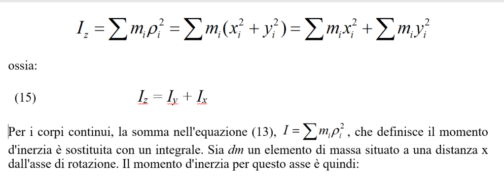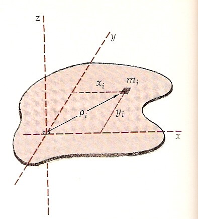Nel caso di una figura piana (sistema piano) si può dimostrare che esiste una relazione fra i momenti d’inerzia rispetto a due assi perpendicolari fra loro e giacenti sulla figura e il momento d’inerzia rispetto a un terzo asse perpendicolare alla figura. Se x, y e z sono assi perpendicolari per una figura che giace nel piano xy, il momento d’inerzia rispetto all’asse z è uguale alla somma dei momenti d’inerzia rispetto agli assi x e y. Questa asserzione non è difficile da dimostrare. La figura seguente rappresenta una figura piana nel piano xy.