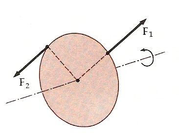 Consideriamo ora la dinamica della rotazione di un corpo rigido. Perché vari l'energia cinetica di rotazione di un corpo rigido, una forza deve eseguire un lavoro sul corpo. Si considerino le forze Fl ed F2 agenti sul bordo di una ruota, com'è indicato nella figura.