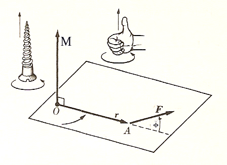 . Tenendo presenti le proprietà del prodotto vettoriale, il momento è rappresentato da un vettore perpendicolare sia ad r che ad F; vale a dire, perpendicolare al piano passante per r e per F, e diretto come il senso di avanzamento di una vite destrorsa che ruota nel medesimo senso della rotazione prodotta da F intorno ad O. Ciò è indicato nella figura seguente.