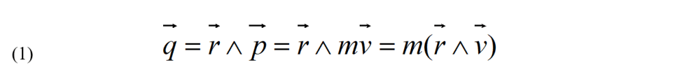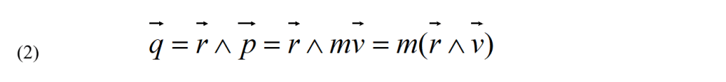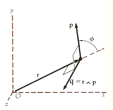 Sia ora il punto A delle ultime due figure un punto in moto rispetto ad un dato riferimento e p = mv la sua quantità di moto. Per definizione, il momento angolare o momento della quantità di moto q di una particella rispetto all'origine O è il prodotto vettoriale del vettore posizione r per la quantità di moto p (si veda la figura)