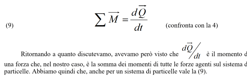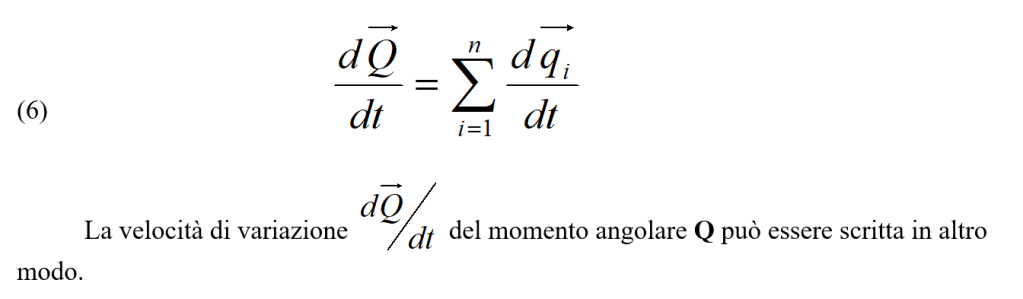 Sia G il baricentro di un sistema di punti in moto rispetto ad un sistema inerziale e sia v la velocità di G rispetto a tale riferimento. Si indichi con vi la velocità di un generico punto Pi del sistema- Si consideri ora una terna di riferimento con l’origine in G e gli assi orientati verso direzioni fisse. Detta wi la velocità di Pi rispetto a questa terna, dalla cinematica dei moti relativi si ricava: