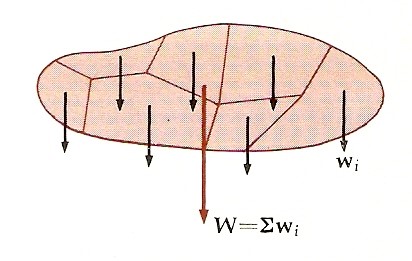 Si può usare questo risultato per dimostrare che la forza di gravità esercitata sulle varie parti di un corpo può essere sostituita con un’unica forza, il peso totale, agente nel centro di massa. La figura seguente rappresenta un corpo costituito da parecchie piccole particelle, ciascuna di peso wi. Il totale è W = Σ wi.