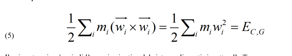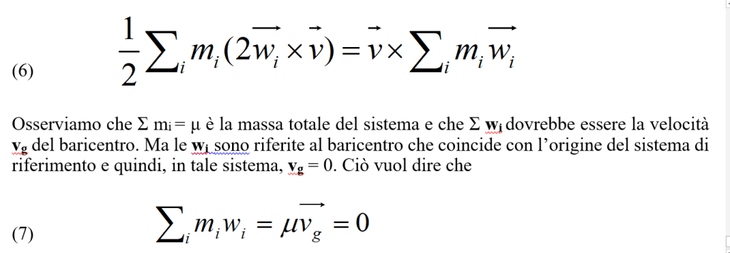 Osserviamo che Σ mi = μ è la massa totale del sistema e che Σ wi dovrebbe essere la velocità vg del baricentro. Ma le wi sono riferite al baricentro che coincide con l’origine del sistema di riferimento e quindi, in tale sistema, vg = 0. Ciò vuol dire che