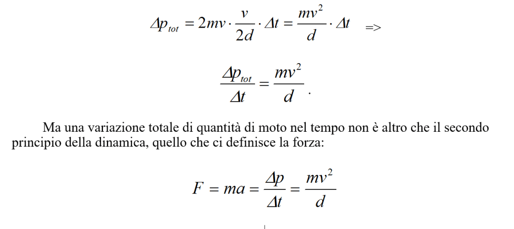 Quindi, per ogni urto si ha una variazione di quantità di moto pari a 2d/v; nel tempo Δt si ha il numero di urti ora visto; quale sarà la variazione totale di quantità di moto Δptotnel tempo Δt ? Si ha: