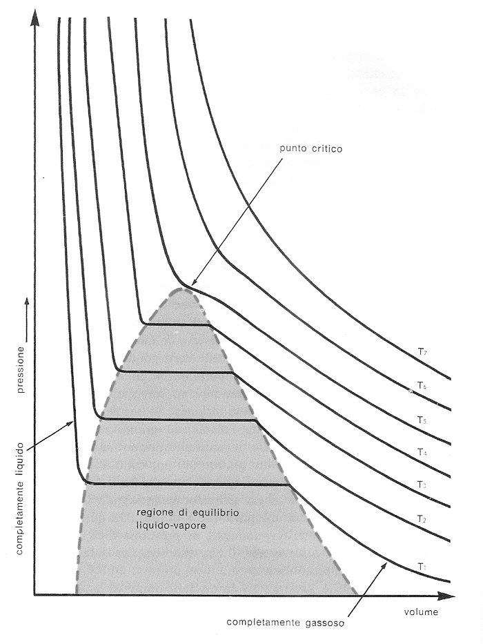 Isoterme di un gas reale (C02) secondo le misurazioni di Andrews. Esse seguono approssimativamente la legge di Boyle a temperature elevate (T7), mentre a temperature basse sono più complicate e sotto il punto critico, in corrispondenza del quale coesistono le due fasi liquido-vapore e gassosa, esiste una regione di liquefazione.