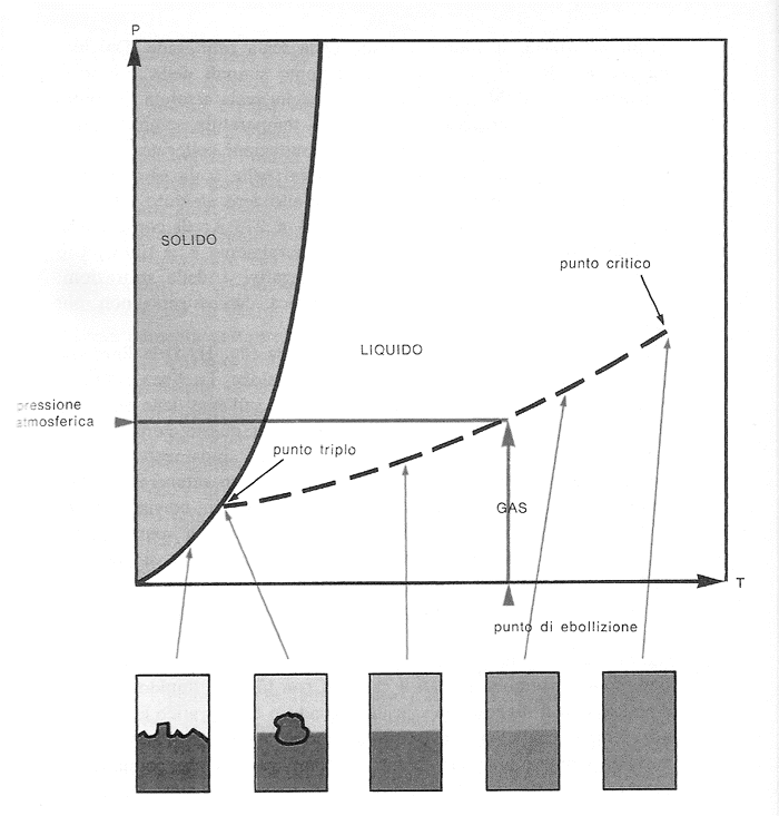 Il diagramma di stato pressione-temperatura fornisce le curve alle quali sono in equilibrio le fasi solida, liquida e gassosa di una stessa sostanza. Si noti che sopra il punto critico le fasi liquida e gassosa non sono distinte, ma si confondono l’una nell’altra. In corrispondenza del punto triplo coesistono le tre fasi, solida, liquida e gassosa.