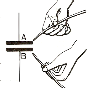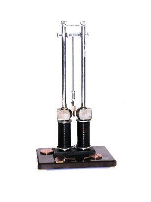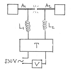 A1 e A2 sono le due asticelle che costituiscono il dipolo e tale dipolo è equivalente ad un circuito oscillante RLC. Tra le estremità delle asticelle affacciate scocca la scintilla. Esse sono collegate tramite una linea bifilare al trasformatore T (mentre V è una resistenza variabile). Tra le asticelle e il secondario del trasformatore sono presenti due induttanze L1 e L2 dette di “zavorra” costituite da otto avvolgimenti di circa 1.5 cm di diametro di filo di rame smaltato di 1mm di diametro (vedi figura 3). La loro reattanza X= w L è tale da lasciar passare correnti a bassa frequenza (50 Hz), e bloccare correnti ad alta frequenza. Quando scocca la scintilla la corrente oscillante sul dipolo è di frequenza tanto alta da non riuscire ad attraversare le induttanze e tornare indietro lungo la linea bifilare danneggiando il trasformatore. Il segnale a bassa frequenza proveniente dal trasformatore che alimenta il dipolo continua invece a fluire dal trasformatore al dipolo. Da notare che l’antenna è un dipolo su cui corrono le cariche risultando accelerate.