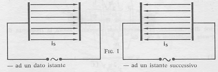Secondo tutte le teorie fisiche precedenti, la presenza di un condensatore in un circuito significava semplicemente il blocco del passaggio della corrente (il condensatore nel circuito equivaleva ad un taglio del cavo conduttore): le armature del condensatore si caricavano di segno opposto e tra di esse si creava un campo elettrico con direzione e verso determinati dalle polarità delle armature. Maxwell, sulle orme di svariate ricerche sperimentali in proposito portate a termine da Faraday, non riusciva a pensare un condensatore come un taglio fatto nel circuito di conduzione e concentrò in modo speciale la sua attenzione sul materiale isolante che separa le armature del condensatore. Secondo la sua teoria quest’isolante doveva diventare sede di correnti istantanee di spostamento. In definitiva si tratta di considerare tutte le correnti come chiuse, e ciò anche quando il circuito è aperto (caso del condensatore). Ma cos’è una corrente di spostamento? Le sue caratteristiche sono peculiari; è una sorta di stress, di stato di sforzo cui viene istantaneamente sottoposta la «materia» isolante che separa le armature del condensatore quando quest’ultimo è caricato. Le «molecole» costituenti il materiale isolante sono formate da cariche positive e negative; l’applicazione di un campo elettrico esterno sposta le cariche positive di queste molecole verso l’armatura caricata negativamente e, viceversa, sposta le cariche negative delle stesse molecole verso l’armatura caricata positivamente. Lo spostamento delle cariche dalle loro posizioni di equilibrio è piccolo e, appena avvenuto, nasce in ogni molecola una forza elastica di richiamo che tende a riportare la situazione nello stato di non stress. Ma, quando questo spostamento istantaneo di materia si è prodotto, se l’alimentazione del circuito seguita ad essere in corrente continua, tutto si stabilizza in una situazione di isolante polarizzato e non vi è più nessuna corrente di spostamento (come una membrana che, tirata da una parte, resta in questa posizione finché non cessa la sollecitazione). Ma se alimentiamo il circuito con una corrente che cambia continuamente verso (ad esempio, una corrente alternata) allora le armature del condensatore cambiano continuamente di polarità, con una frequenza che è la stessa della corrente che alimenta il circuito. Ciò comporta che il campo elettrico che si genera tra le armature del condensatore cambia continuamente verso e, conseguentemente, nel condensatore (o meglio, nel mezzo isolante che separa le sue armature) si generano correnti di spostamento alternativamente dirette in un senso ed in senso opposto (come una membrana che sia sollecitata alternativamente in un senso ed in senso opposto). La figura 1 illustra la situazione ora descritta.