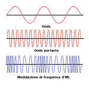 Se ci limitassimo a quanto detto avremmo prodotto un’onda elettromagnetica stazionaria ad ampiezza costante che sarebbero così rilevate dalla ricevente (onda portante). Un tale segnale non fornisce alcuna informazione se non il fatto che c’è un segnale (corrisponde ad emettere con la bocca un suono prolungato e non modulato). Per poter trasmettere informazioni e quindi un messaggio dobbiamo generare onde le cui caratteristiche di ampiezza e frequenza varino nel tempo riproducendo le caratteristiche del messaggio. Questo processo si chiama appunto modulazione. Il più semplice sistema consiste nell’interrompere con un tasto il segnale dopo un tempo breve o relativamente lungo (il punto e linea dell’alfabeto Morse). Oggi si usano almeno i due sistemi riportati in figura, la Modulazione di Frequenza e la Modulazione di Ampiezza. Per ottenere queste modulazioni occorre trasformare il segnale audio (ad esempio la nostra voce) che vogliamo trasferire in un segnale elettromagnetico. Ciò si realizza mediante un microfono collegato ad un amplificatore (il microfono è uno strumento che trasforma un’onda sonora incidente in un segnale elettrico proporzionale alla pressione ricevuta. E’ costituito da due lamine vicinissime costituenti un condensatore, ed una di tali lamine riceve il segnale acustico. La vibrazione di questa lamina fa variare la capacità del condensatore e quindi la carica sulle sue armature che fa passare una corrente nel cavo al quale è connesso il condensatore, corrente proporzionale alla variazione di C. Ciò provoca una variazione di differenza di potenziale ai capi della resistenza del circuito che è il segnale audio). Una volta trasformato il nostro segnale (onda) occorre sommarlo in un modulatore con la portante in modo da ottenere il segnale definitivo modulato o in AM (facendo incidere l’onda proveniente dal microfono sul collettore di un transistor) o in FM (l’onda proveniente dal microfono in questo caso fa variare la capacità del circuito oscillante che produce la portante mediante un opportuno diodo a semiconduttore, il varicap, e quindi la sua frequenza in proporzione al segnale audio). L’FM dà segnali molto precisi e definiti che si deteriorano a distanza; l’AM dà segnali meno precisi che possono essere inviati a distanze maggiori.