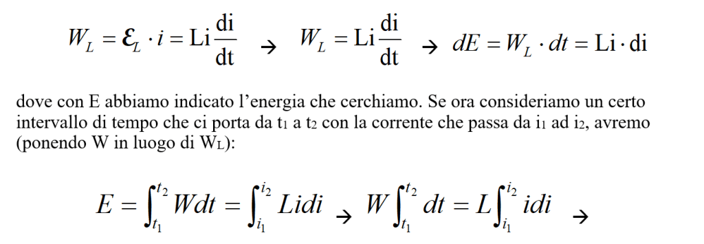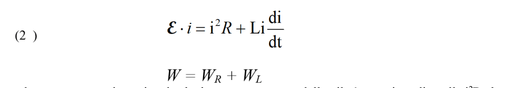 e da questa espressione si vede che la potenza erogata dalla pila è maggiore di quella i2R che va in calore nel circuito se dovessimo considerare solo un circuito con resistenza R. Quanto vale e dove va a finire questa energia in più ? Sembra evidente che essa debba essere pensata come immagazzinata dall’induttanza L sotto forma di energia magnetica chiamata energia intrinseca della corrente.