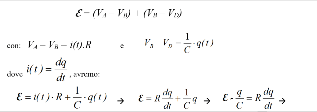 Quando T viene chiuso (trattino rosso di figura) delle cariche verranno inviate dal generatore V nel circuito. Supponiamo sia q = q(t) la carica che ha attraversato una sezione del conduttore all’istante t. Poiché è:
