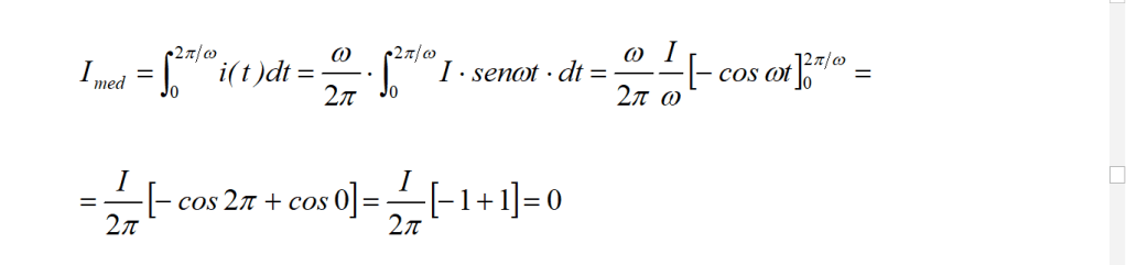 e risulta che l’intensità media Imed è circa 2/3 volte (poiché 2/π ~ 2/3) l’intensità massima I e corrisponde all’area del rettangolo di figura. Se ci calcoliamo Imed per un periodo completo, da 0 a 2π/ω, troviamo: