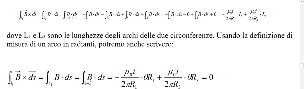 Il percorso non si avvolge intorno al filo. I tratti 2 e 4 sono nella direzione radiale mentre i tratti 1 e 3 sono parti di circonferenze con raggio rispettivamente uguale a R1 e R3. Il prodotto scalare è nullo nei tratti 2 e 4, pertanto da essi non viene alcun contributo. Nei rimanenti tratti il campo B e lo spostamento infinitesimo ds sono paralleli o antiparalleli, per cui: