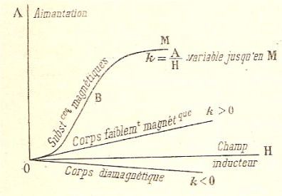 La curva più in alto è quella per la magnetizzazione di sostanze ferromagnetiche. Quella intermedia è per le paramagnetiche. L’ultima è per le diamagnetiche.