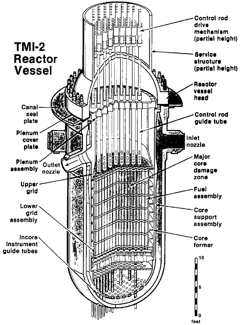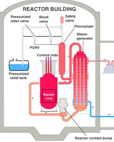 anche un cilindro bianco tra il generatore di destra ed il nocciolo. Tale cilindro è il pressurizzatore che svolge un ruolo fondamentale: serve a mantenere l’acqua del circuito di raffreddamento del reattore (circuito primario) ad una pressione sempre elevata e tale da non mandarla in ebollizione. Nel pressurizzatore di TMI-2 vi erano circa 23 metri cubi di acqua con circa altrettanti metri cubi di vapore sovrastanti. La pressione del vapore viene regolata scaldando o raffreddando l’acqua del pressurizzatore che, a sua volta, viene utilizzata per regolare la pressione dell’acqua di raffreddamento del reattore.