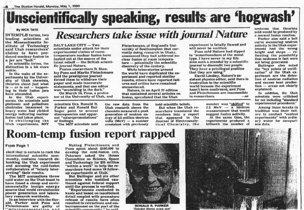 Il discredito su questa scoperta fu probabilmente indotto dall’Università di Salt Lake City. La fretta di annunciare la scoperta per ottenere finanziamenti, l’eccessiva enfasi data alla medesima, l’annuncio tramite conferenza stampa di un qualcosa ancora non perfettamente definito sono sempre esiziali al modo di procedere in ambito scientifico (è da notare che Fleischmann e Pons, in conferenza stampa, non fornirono tutti i dettagli dell’esperienza perché l’Università non aveva ancora concluso le pratiche del brevetto). Quando una qualunque scoperta ha un qualche sapore di grande novità con possibilità applicative non troppo nascoste i mass media si lanciano su di essa e la bruciano perché viene indotta nel pubblico la credenza che i risultati saranno disponibili in tempi molto rapidi. Se poi questo non accade gli stessi mass media si scagliano contro chi ha dato una tale illusione. Ma c’è dell’altro perché un’altro scienziato, Steven Jones (Brigham Young University), aveva intuito cose analoghe (la presenza di fenomeni nucleari spontanei) per vie completamente diverse, osservando alcune reazioni che si producevano nelle rocce vulcaniche. Avrebbero dovuto incontrarsi i tre per discutere a fondo la questione e per darne un annuncio insieme attraverso un articolo in una rivista scientifica. Ma poi, come detto, fu molto probabilmente l’Università di Fleischmann e Pons che spinse a dare l’annuncio nel modo indicato. Un altro aspetto legato alla priorità di eventuale pubblicazione, in questo caso su Nature, non è stato chiarito dal direttore dell’epoca della rivista, John Maddox. Sembrerebbe che nello stesso giorno della convocazione della conferenza stampa di Fleischmann e Pons (il 23 marzo), sia stato presentato a Nature, da Steven Jones, un articolo sull’argomento, ma Maddox rifiutò spiegazioni su questo problema ed anche sull’eventualità che i due chimici abbiano, a loro volta, presentato un articolo sulla Fusione Fredda.