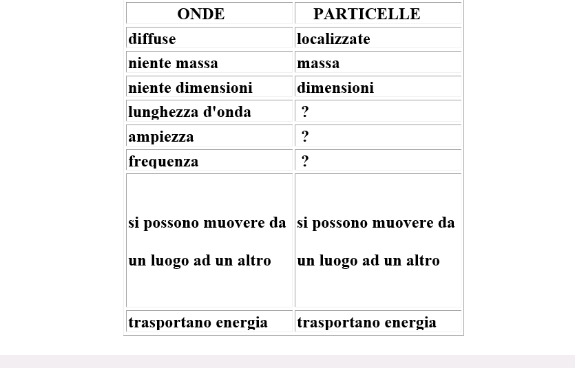 Secondo la teoria ondulatoria l’energia trasportata da un’onda è proporzionale alla sua ampiezza. Tale energia non dipende in alcun modo dalla frequenza dell’onda. Per intenderci, a parità di ampiezza, un’onda luminosa rossa ed una viola, trasportano la stessa energia. Quindi se inviamo un’onda rossa ed una viola (con medesime ampiezze A) contro un ostacolo, esse dovrebbero cedere all’ostacolo la stessa quantità di energia. Sperimentalmente LE COSE NON VANNO COSI’! Se disponiamo di una lamina metallica e, su di essa, inviamo luce gialla o viola, anche con ampiezze differenti (maggiore la gialla della viola), accadono fatti straordinari o, perlomeno, non comprensibili con l’ordinaria teoria ondulatoria.