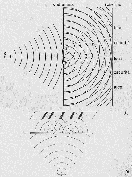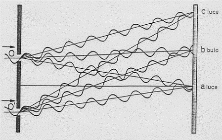Se il cammino di un’onda luminosa, dalla sorgente ad uno schermo, viene interrotto da un diaframma con due piccole ed opportunamente distanziate fenditure, sullo schermo si vedranno zone illuminate alternate da zone buie (fig. 3a e 3b).